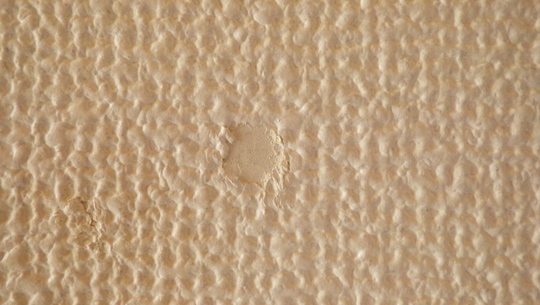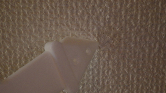 ③壁紙用ノリで貼り付けます。このとき、破れた箇所の大きさと移植するクロスの大きさを合わて、凹凸を馴染ませます。