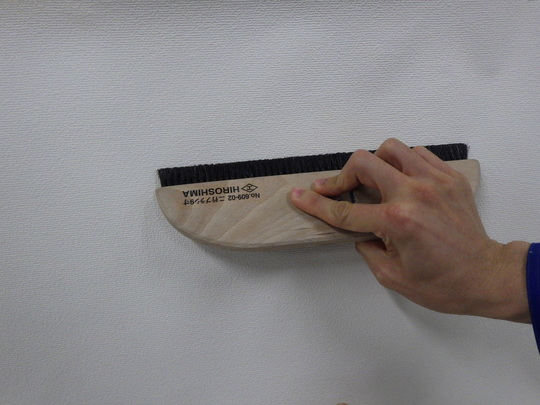 ビニル壁觝の直張りは、裏面の空気を追い出すようにしながら、横になでないで丈に沿っておさえるよう平均になでてしわを伸ばしていきます。