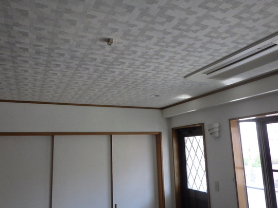 部屋全体の写真だと分かりずらいかもしれませんが、吹付け前では天井のシーリングライトの焼け跡が残ってますが、吹付け後ではキレイになっています。