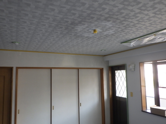 今回は壁面と天井面に「廻り縁」という見切り材がありましたので、それを全てマスキングテープで養生するのが大変でした。