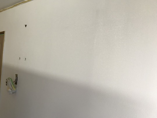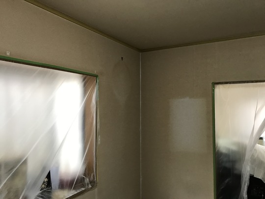 廻り縁や巾木などクロスメイクしない箇所はしっかりとマスキングテープで養生して、床はマスカーで完全養生して、天井と壁をクロスメイクしました。